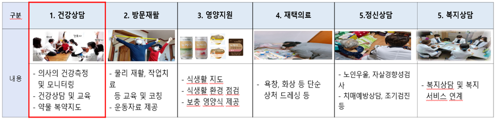 - 건강 관리 교육: 식습관, 운동법, 복약 관리 등 건강 유지 방법 안내