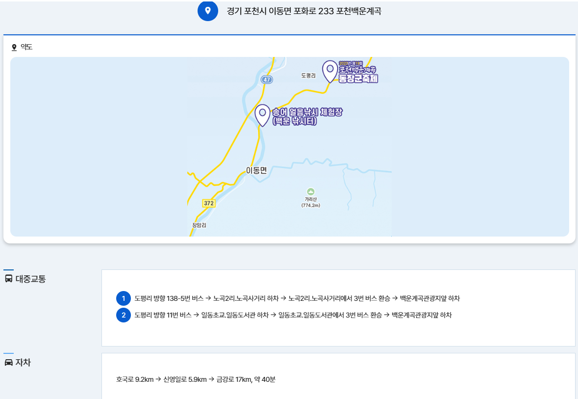 주차: 포천 백운계곡 동장군축제 공영주차장을 무료로 이용할 수 있습니다.