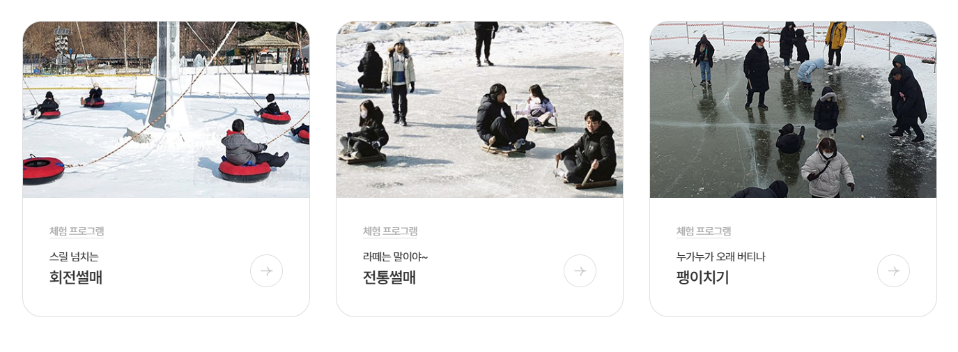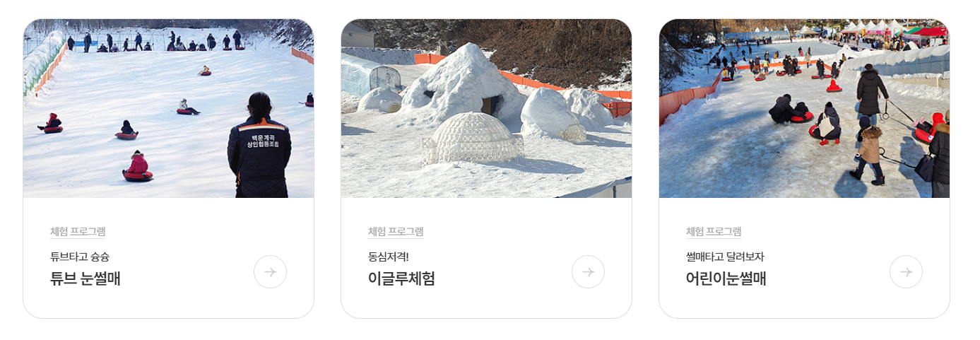 - 눈썰매 : 포천 백운계곡 동장군축제의 대표 프로그램으로, 120m 길이의 눈썰매를 즐길 수 있습니다.
