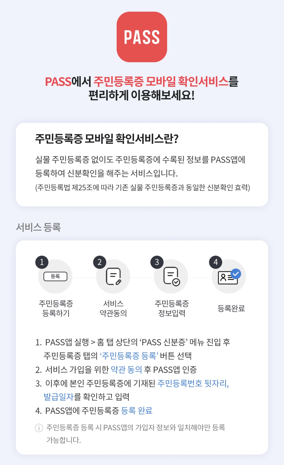 - 본인 인증: PASS 앱 등을 통해 본인 인증을 진행합니다.