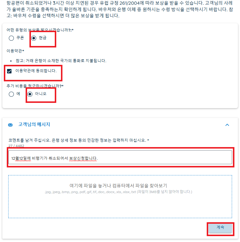 8. 그리고 이 내용은 원하시는대로 기입하시면 됩니다. 저는 현금으로 받고싶어서 현금을 클릭했고, 추가 비용은 발생한내용이 없어서 아니오를 클릭했습니다. 메세지는 그날 상황을 설명해주시면되는데 이 내용은 코멘트를 남기고 계속을 누르셨다고 해도 계속계속해서 클레임 발생시 업데이트할수있도록 나중에 작성을 다한 후 메일이 옵니다.