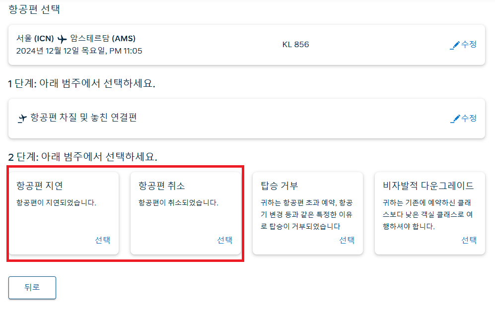 7. 지연일 경우, 항공편 지연 클릭 / 항공편 취소일 경우 항공편 취소 클릭
