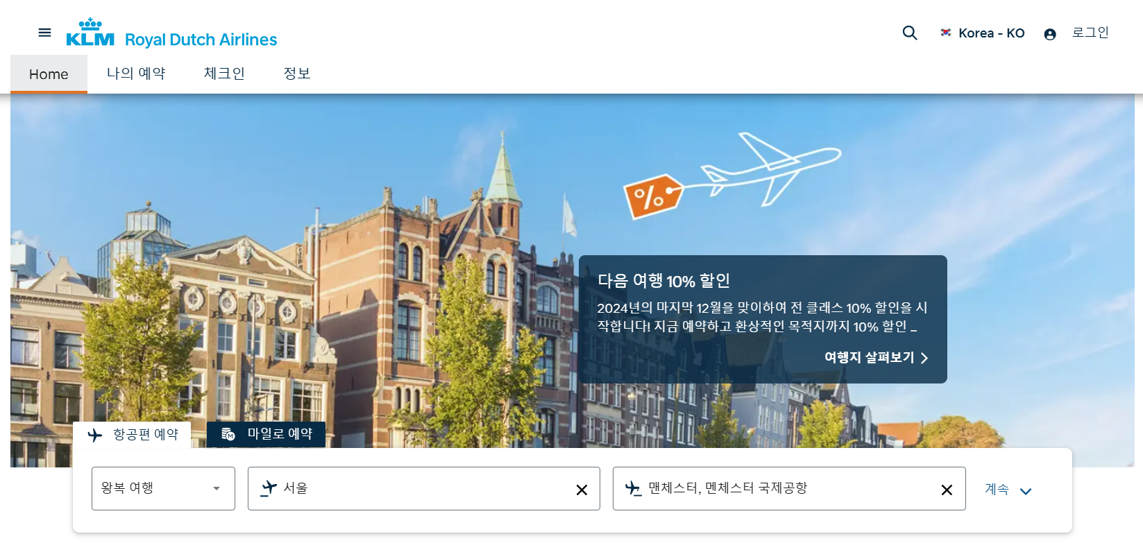 1. 먼저 KLM항공 홈페이지에 접속하여 오른쪽 상단에 로그인을 해줍니다