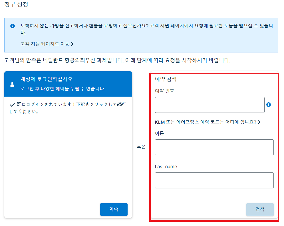 ✔ 참고로 경유하는 비행기 일 경우 1건만 이렇게 신청해주시면 나머지 내용은 고객센터에서 다 확인이 가능하다고 합니다.
