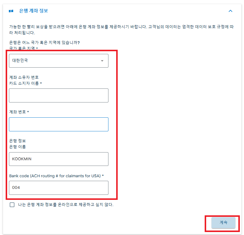9. 고객센터에 문의해보니 될수있으면 영문으로 기입하는게 좋다고하여 카드 소지자 이름도 영문으로 기입했고, 은행 정보도 영문으로 기입했습니다.