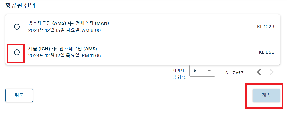 5. 저는 이날 문제가 있었던 KL856항공을 선택했습니다. 계속을 눌러주세요.
