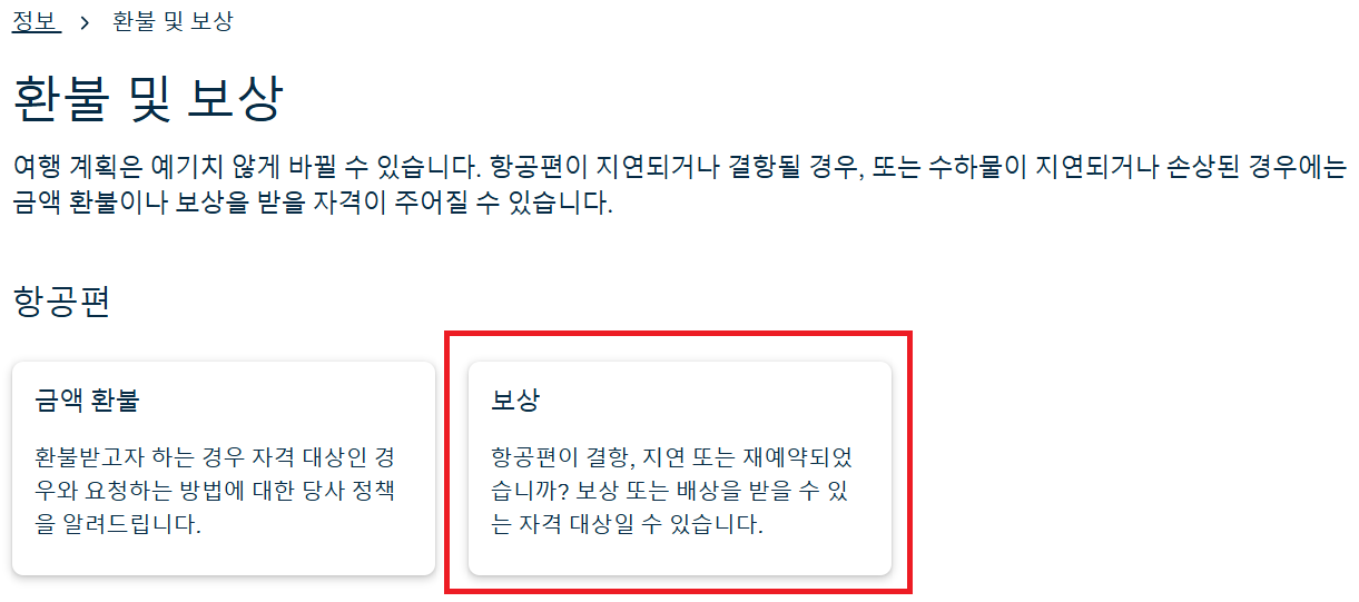 첫번째 보이는 탭에서 여행 예약 및 관리라는 큰 카테고리 밑으로 내려보시면 환불 및 보상 이라는 탭을 클릭해주세요.